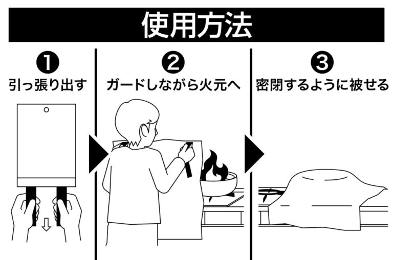 その点、ファイアーブランケットは「つかんで火にかぶせる」だけで使えるため、手順が簡単で心理的な負担も少ないのが特長です。