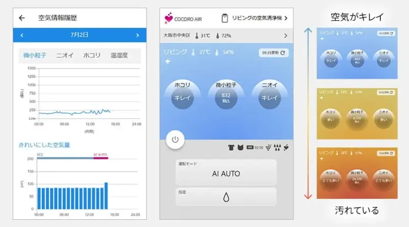 AIモニターで粒子・ホコリ・ニオイ・温度・湿度をリアルタイム表示。さらに、天気や花粉情報、フィルター交換時期を音声やアプリで通知します。