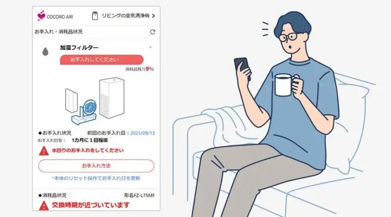 シャープ製エアコンと連動し、空気清浄・加湿・暖房を最適化。おやすみモードも便利です。