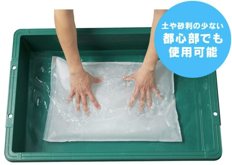 たらいや容器に淡水を張り、袋を沈めて揉みほぐすだけで吸水開始。約3分で約15kg、約5分で最大20kgに膨張します。