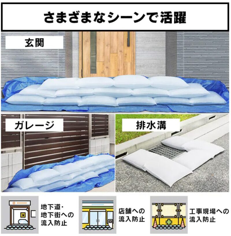 家庭の玄関、店舗の入口、地下駐車場など、浸水リスクの高い場所で効果的。幅約2.2mの止水には10個を三段積みにするのが目安です。