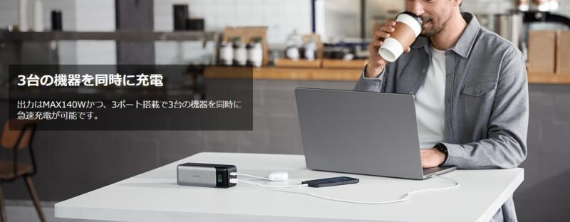 最大出力140Wかつ、3ポート搭載で3台の機器を同時に急速充電が可能。MacBook Pro・iPhone 14 Pro・AirPodsをこれ一つで急速充電が可能です。