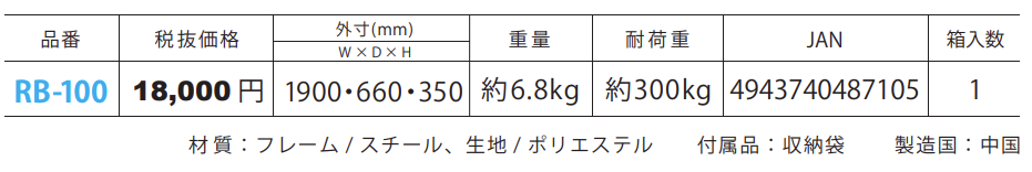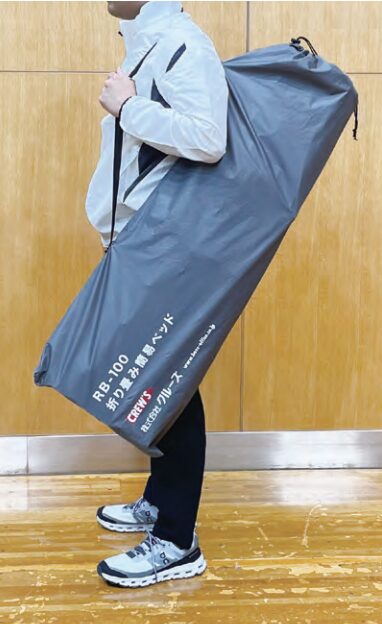 RB-100は広げるだけの簡単組み立てタイプ。収納時はコンパクトで、車や倉庫に保管しやすい設計になっています。また、収納袋付きなので