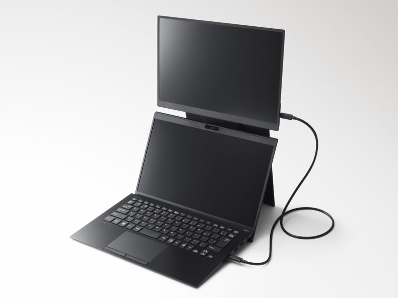 VAIO Vision+ 14Pは、VAIOが提案する「ノートPCのベストパートナー」たるモバイルディスプレイ。14.0型・16:10比率のWUXGA(1920×1200)パネルを採用し、上下二画面に最適化した専用カバースタンドが標準付属。USB PDパススルーに対応する2つのUSB Type‑Cを備え、PCのType‑C端子が1つでも充電と拡張表示を同時に成立させます。